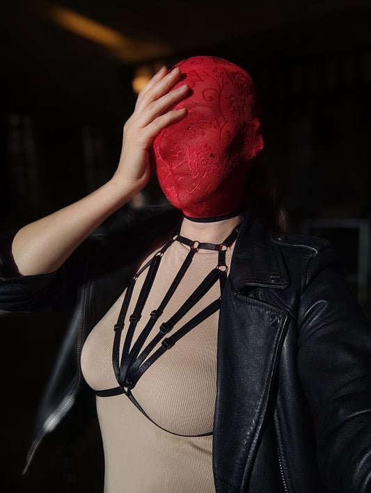 Woman lace hood mask for pole dance and twerk.Rave hood mask for party, festival cosplay.Gothic harness hood mask for women.Hood mask for carnival.